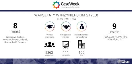 Jeśli lubisz wyzwania oraz jesteś osobą otwartą, aktywną i zdeterminowaną do działania oraz czujesz, że same studia to za mało, CaseWeek jest właśnie dla Ciebie! Już po raz VII stowarzyszenie IAESTE zaprasza na cykl warsztatów inżynierskich IAESTE CaseWeek organizowanych w całej Polsce. Między 11 a 28 kwietnia w 8 miastach, na 9 uczelniach w ramach tegorocznej edycji warsztatów CaseWeek odbędzie się wiele różnych szkoleń, które prowadzone będą przez specjalistów z wieloletnim doświadczeniem w branży.
