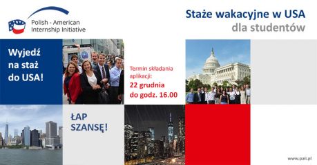 Trwa rekrutacja do kolejnej edycji Polish-American Internship Initiative - programu wakacyjnych praktyk w renomowanych amerykańskich przedsiębiorstwach dla polskich studentów. Na stronie internetowej PAII dostępne są oferty stażowe firm Archer Daniels Midland Company i Pittsburgh Glass Works. Studenci, którzy chcieliby wyjechać na staż w USA w wakacje 2017, mogą składać aplikacje on-line do 22 grudnia 2016.